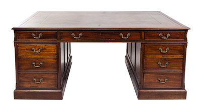 having a rectangular leather-inset top, each side fitted with three aligned drawers, raised on twin pedestals with three graduated drawers each.
