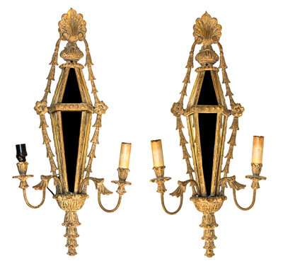 each having a shaped and mirrored back plate surmounted by a shell finial, issuing two S-scroll candle arms.