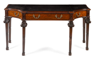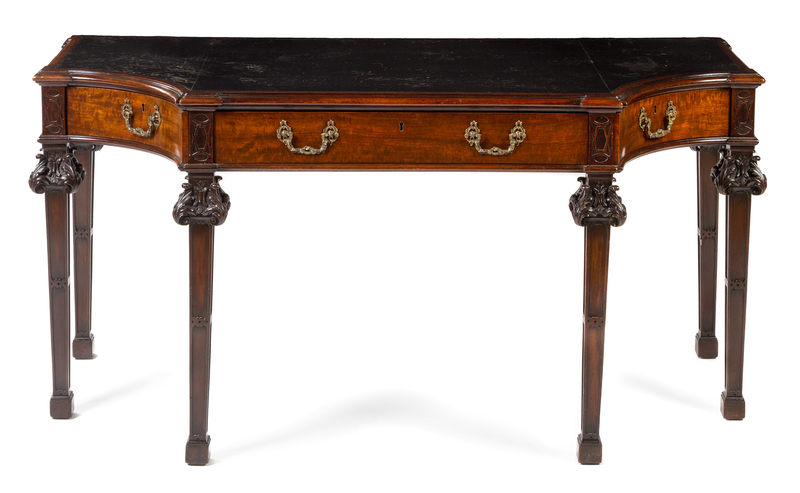 having a rectangular inset black leather top with concave corners and chamfered edges above a conforming frieze fitted with a central long drawer flanked by two concave drawers, raised on square legs with carved acanthus decoration at the knees.