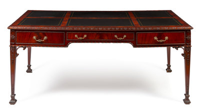 having a rectangular top inset with six tooled black leather panels above one long drawer and two short flanking drawers to each side, raised on square tapering legs ending in spade feet.
