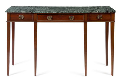 having a green marble rectangular breakfront top over a conforming frieze fitted with a long center drawer flanked by two faux short drawers, raised on square tapering legs.