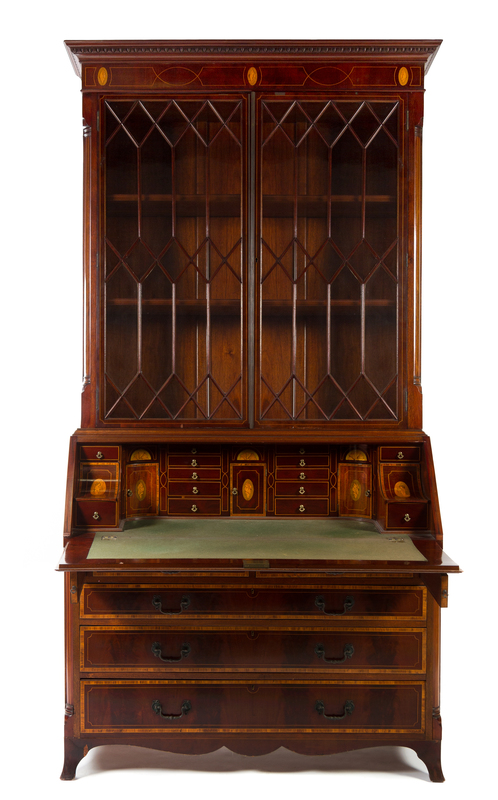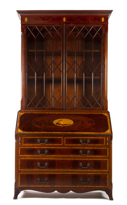 in two parts, the superstructure having a molded egg and dart cornice above glazed doors enclosing three shelves, the lower section having a fall front writing surface opening to a fitted interior above two short drawers and three long graduated drawers, raised on splayed feet.