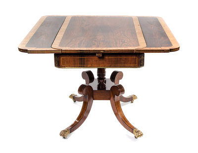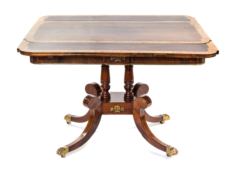 the rectangular banded top having outset ends above two drop leaves, over a paneled apron centered by an anthemion motif and two baluster-form standards, raised on a platform with splayed tapering legs ending in brass paw form caps and casters.