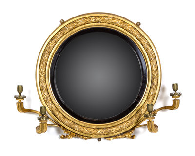 A Regency Giltwood and Ebonized Convex Girandole Mirror