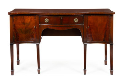 having a serpentine top over a conforming case enclosing a long drawer flanked by a cupboard to each side, raised on square tapering legs ending in spade feet.
