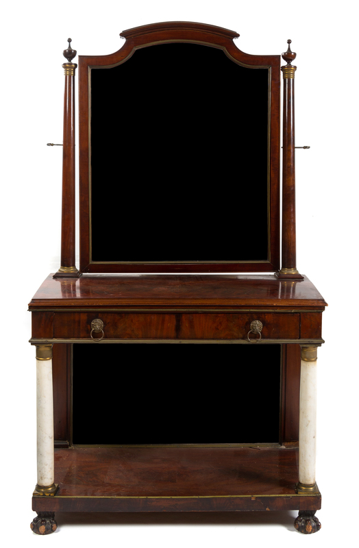 with twin columns supporting a beveled mirror, the rectangular top over a frieze drawer, raised on columnar supports flanking a recess, set on claw and ball feet.
