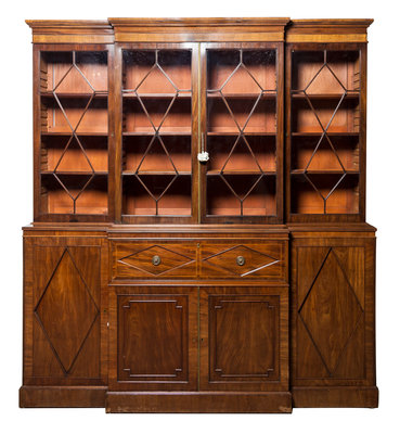 the upper section with glazed doors, the lower section with paneled doors having molded fronts.