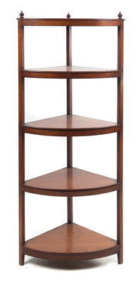 having three baluster form finials above four quarter-round tiers, raised on square feet.