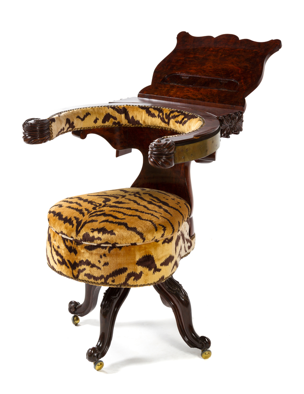 with an adjustable easel swiveling along the top rail, the stuffover compass-shaped seat above four cabriole legs ending in scrolled toes with casters.