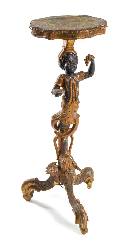 the shaped top with foliate scroll decoration above a blackamoor figural support, raised on a foliate carved tripod base.
