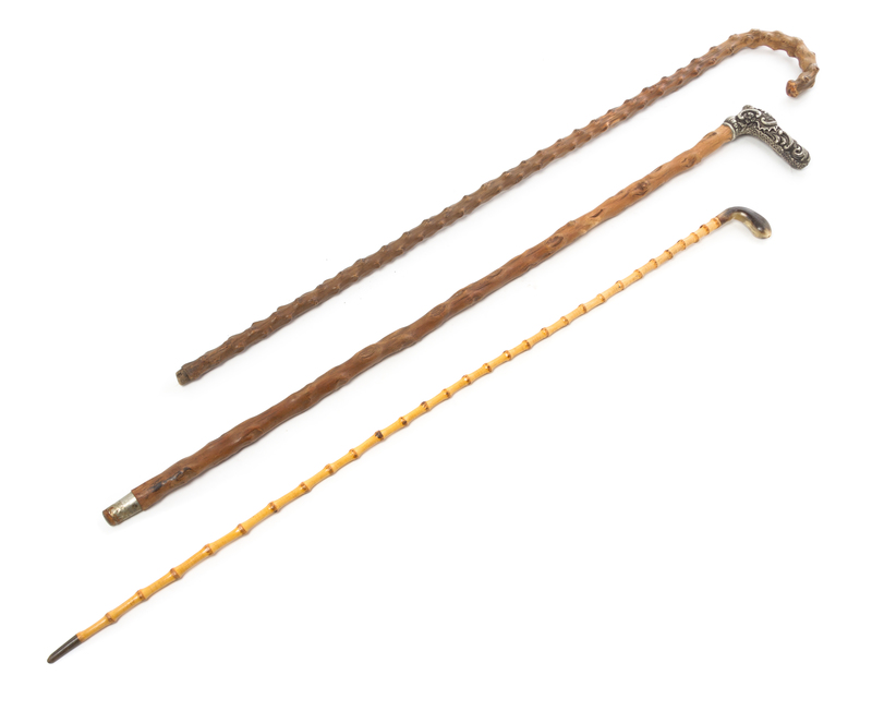 comprising a chased silver handled example with C-scroll and floral decoration above a naturalistic wood shaft ending in a metal ferrule, a horn handled example having a bamboo shaft ending in a horn ferrule, and a naturalistic wood example.