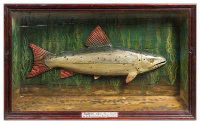 in a shadow box painted to resemble a river environment, the case with a plaque reading Salmon 13 lbs 7 ozs, landed by Sir Richard Tavistock, River Tay, Scotland.