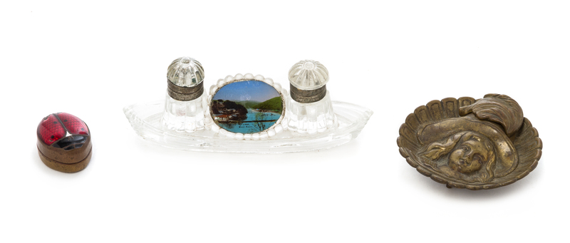 comprising a glass example in the form of a boat with a central oval plaque depicting a river scene and marked Looe, West River, and a bronze figural example depicting a boy wearing a hat with plumage, together with an enameled bronze pill box in the form of a ladybug, marked BM to the underside.