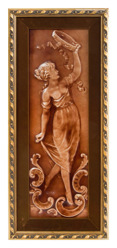 depicting a dancing muse holding a tambourine and surrounded by C-scrolls, set in a gilt frame.