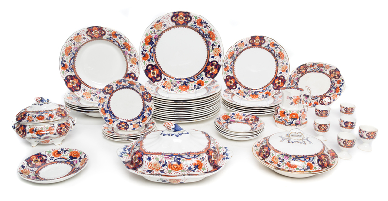 in the Imari palette, comprising 34 dinner plates, 13 soup bowls, 16 salad plates, eight dessert plates, five bread plates, six saucers, an oval serving dish, three covered tureens of varying size, a creamer and six egg cups, each with transfer printed mark to the underside; 93 items total.