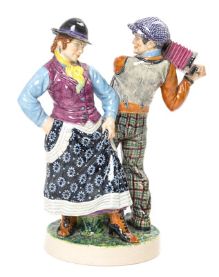 modeled to show a dancing woman and a man playing an accordion, raised on a circular naturalistic base, incised C. VYSE CHELSEA to side.