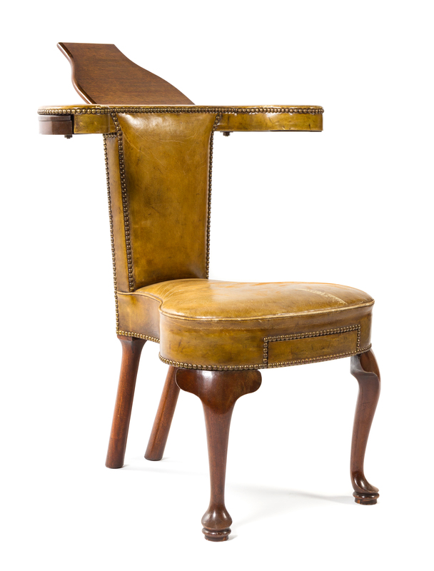 having a sliding adjustable reading ledge and swiveling compartments above a shaped back and a stuffover seat, raised on cabriole fore-legs.