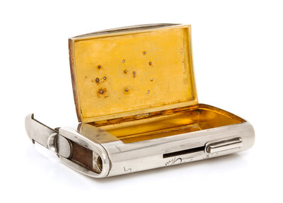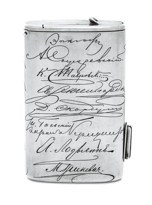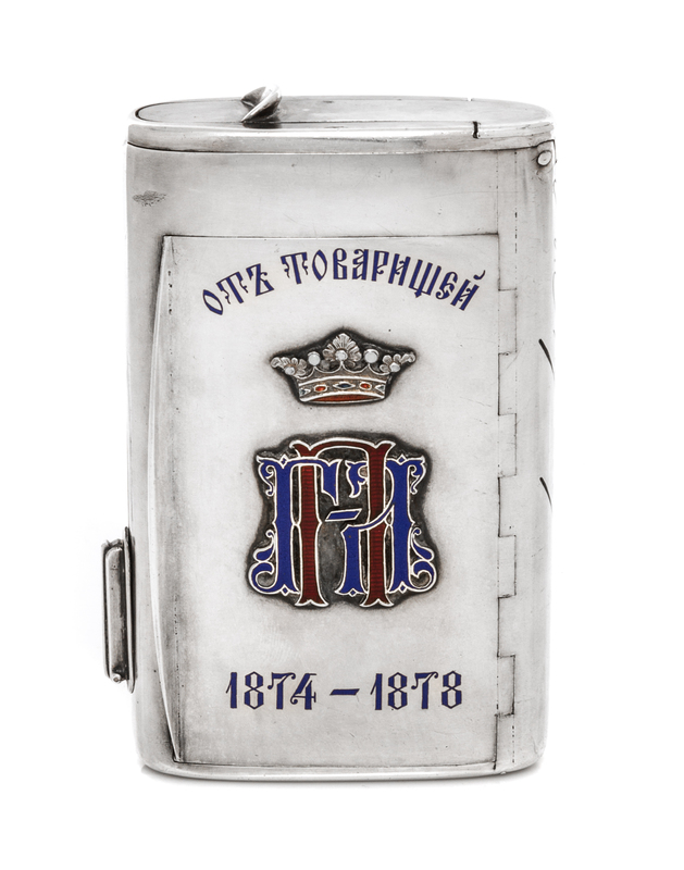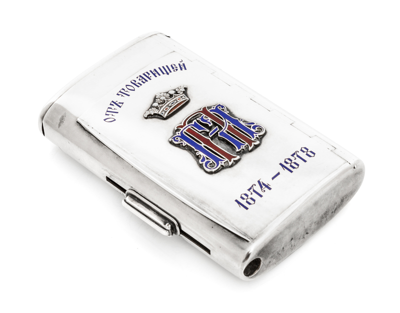 the lid with an applied enameled monogram and coronet with commemorative dates, the underside decorated with niello facsimile signatures, the side of the case having an adjustable tinder cord holder and an additional hinged lid with a match strike and a compartment.