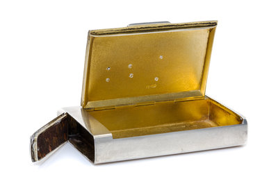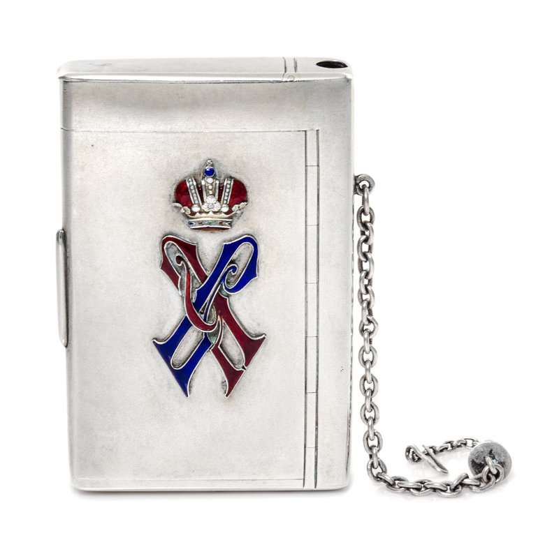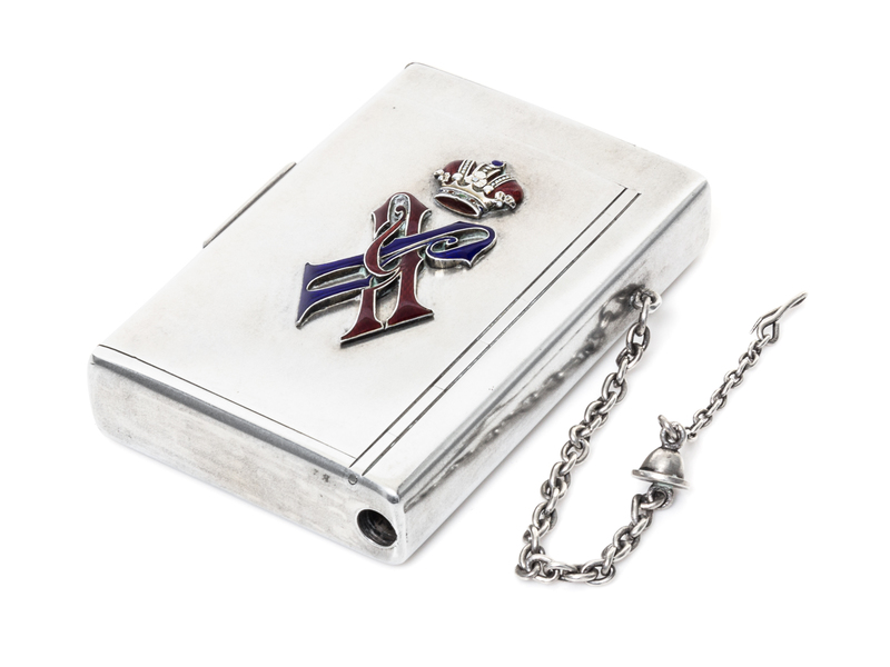 the lid bearing an applied guilloche monogram and coronet of Grand Duke Vladimir Alexandrovich Romanov, the side with a separate hinged compartment for matches.