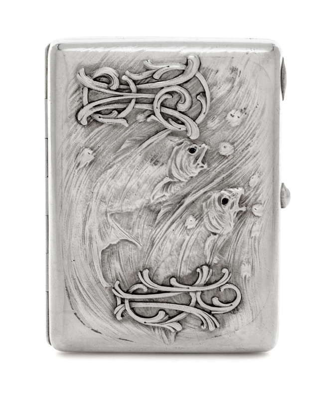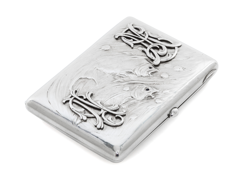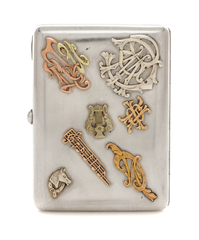 the case worked to show two swimming fish with jeweled eyes and applied monograms, the underside with applied monograms and charms.