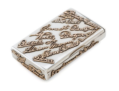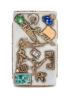 the case decorated with numerous applied silver-gilt and enamel charms.