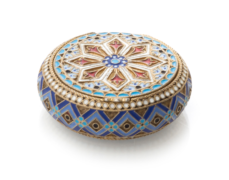 of circular form, the case decorated with polychrome geometric enameling and centered with a flower.