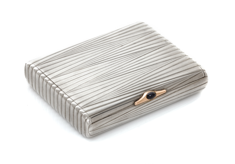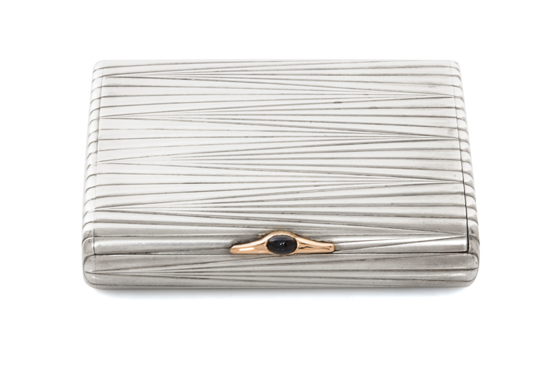 scratched inventory number 371, the case decorated with a radiating wave pattern, the hinged lid having a stamped 583 gold and sapphire cabochon inset thumb-piece.