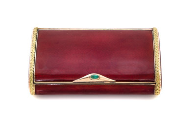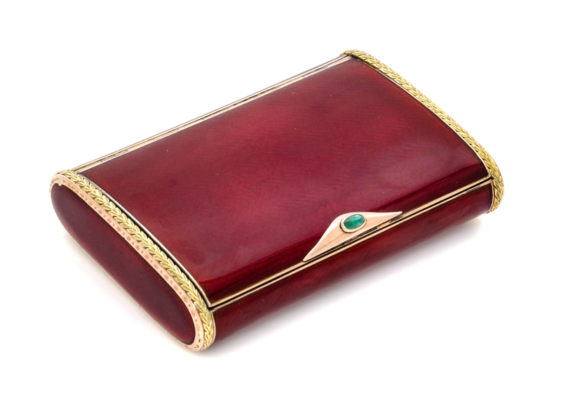 the case decorated with translucent red over a wavy ground, the sides with silver-gilt foliate bands, the hinged lid with an emerald cabochon inset thumb piece.