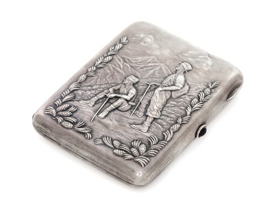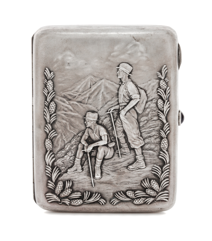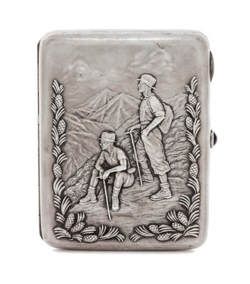 the lid with raised decoration of hikers in a mountainous setting set within a needle and pinecone border, the underside decorated with the monogram AK and having a purple stone cabochon clasp.
