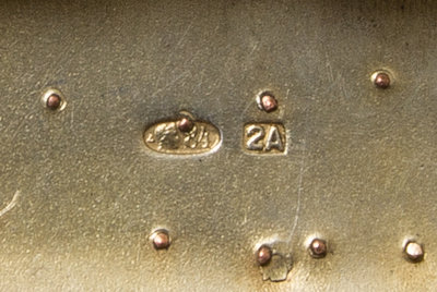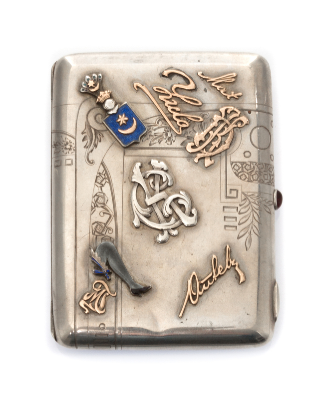 the case having applied monograms, silver-gilt and enameled charms, the lid engraved with geometric and foliate decoration and having a red colored cabochon clasp.