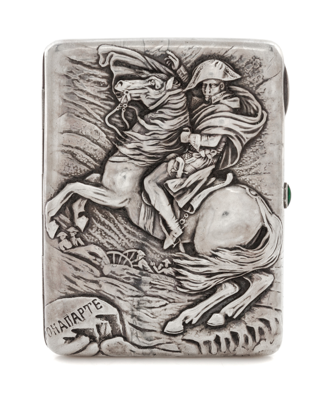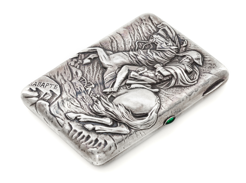 the case depicting Napoleon Crossing the Alps after Jacques-Louis David, with a green cabochon clasp.