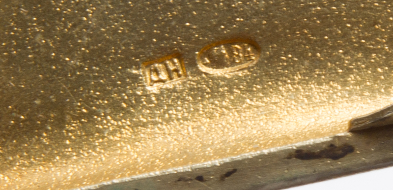 the lid with an enameled cartouche depicting a peacock surmounting a line of repousse polar bears, the underside worked in the samorodok style and having a blue cabochon clasp.