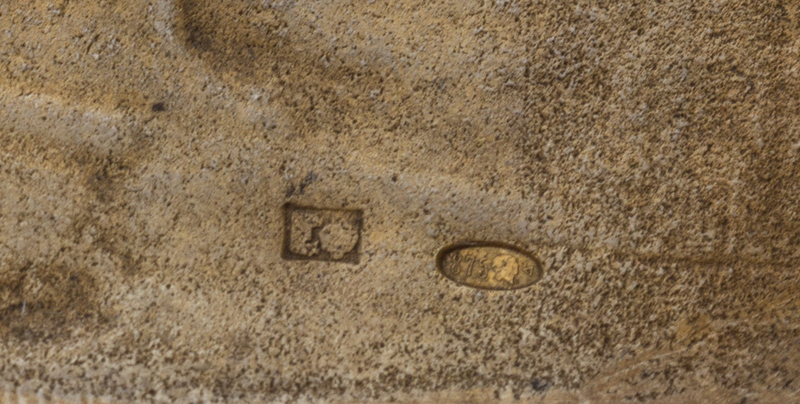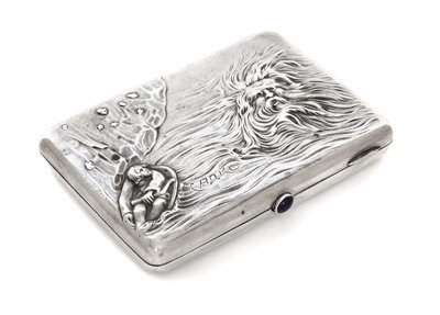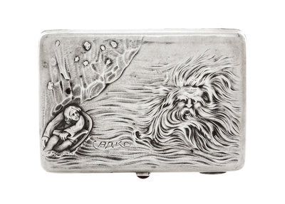 the lid worked with a scene from the story of Sadko and engraved SADKO in Cyrillic, the underside with a Cyrillic inscription and having a purple cabochon clasp.