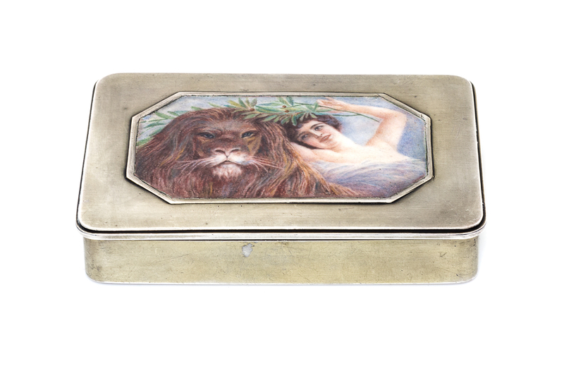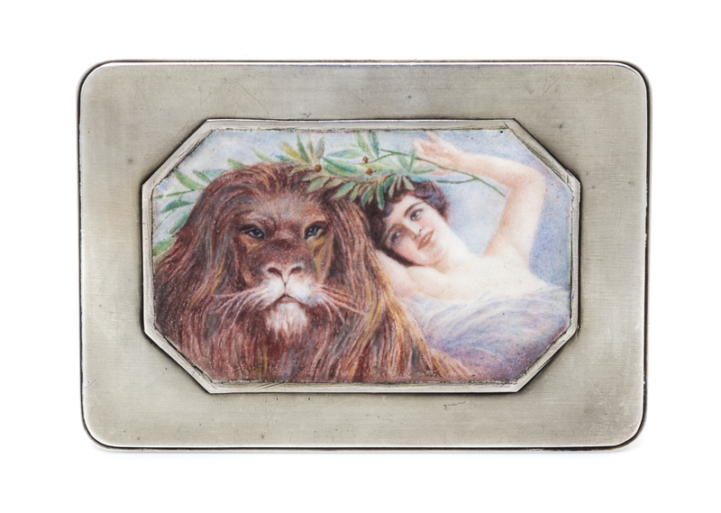 the lid centered by a painted plaque decorated with a woman and a lion.