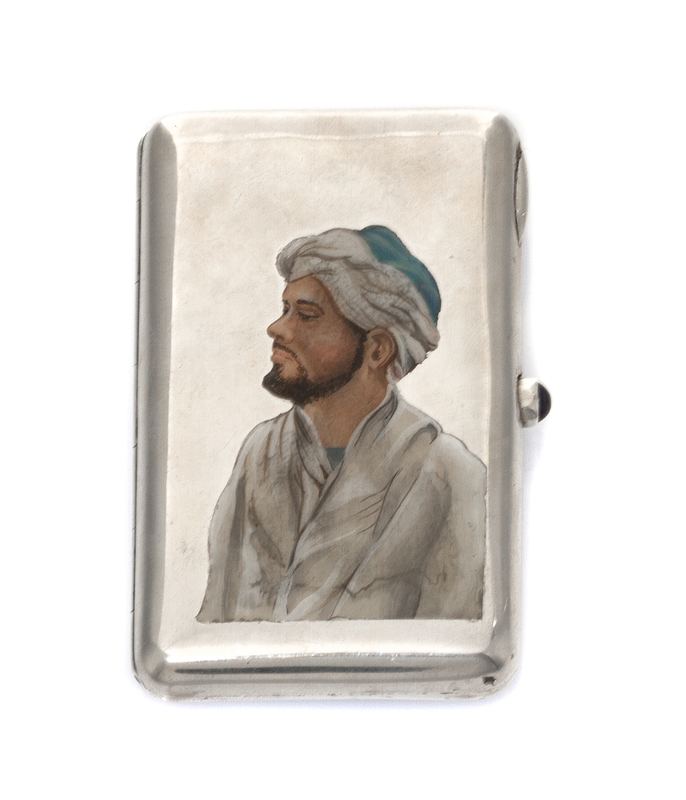 the lid decorated with an enamel portrait of a man in a turban, having a blue cabochon clasp.