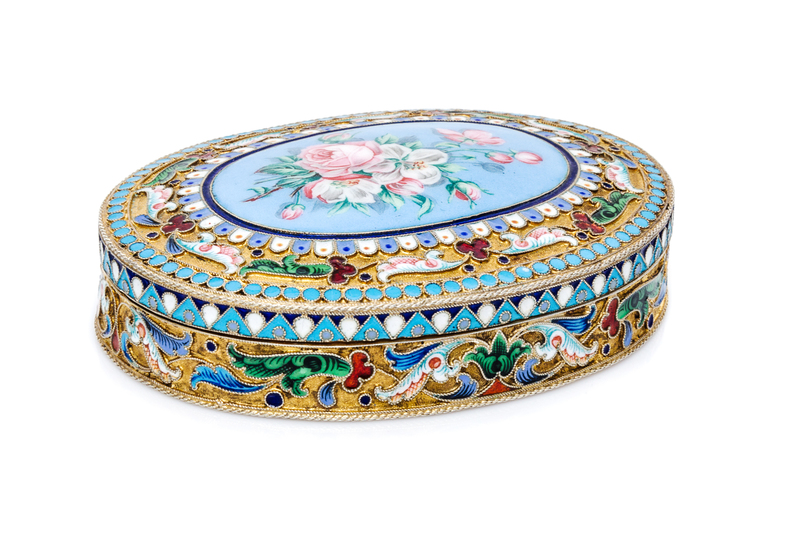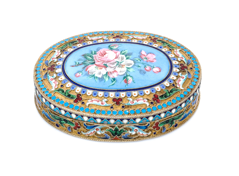 of oval form, the lid centered by an enamel plaque decorated with flowers, the side and lid rim decorated with polychrome enamel leaves and flowers.