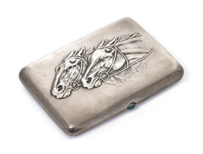 the lid worked to show two horses racing and having a green cabochon clasp.
