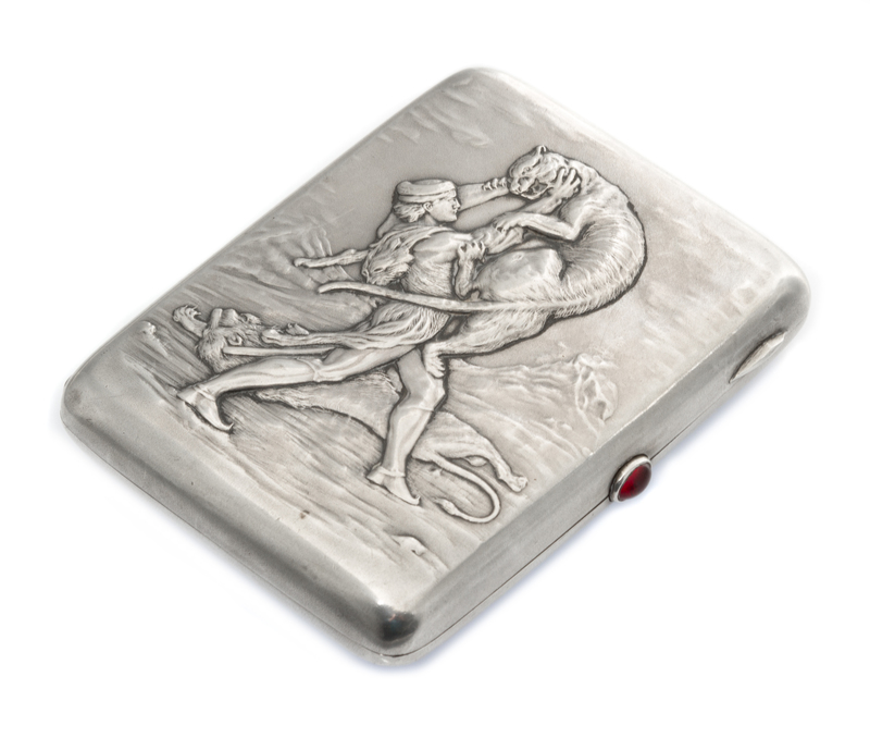 the lid worked to show a man in combat with lions, having a red cabochon clasp.