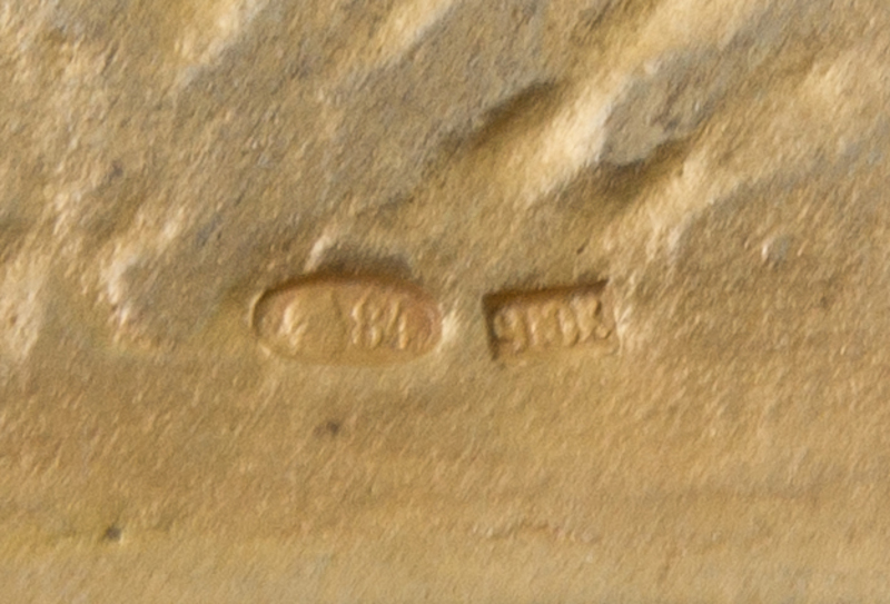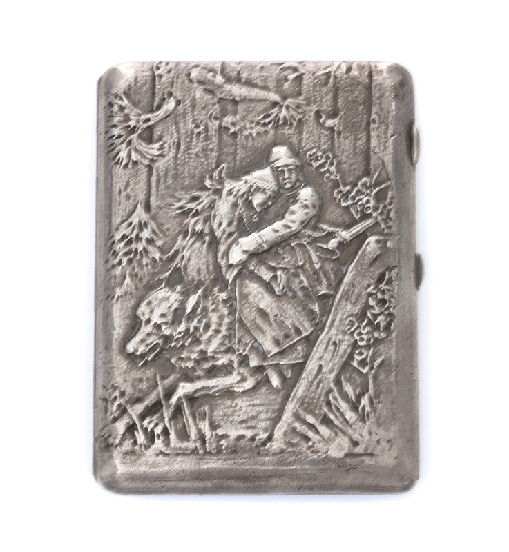 of rectangular form, the lid worked to show a man and woman riding a wolf through a forest scene.