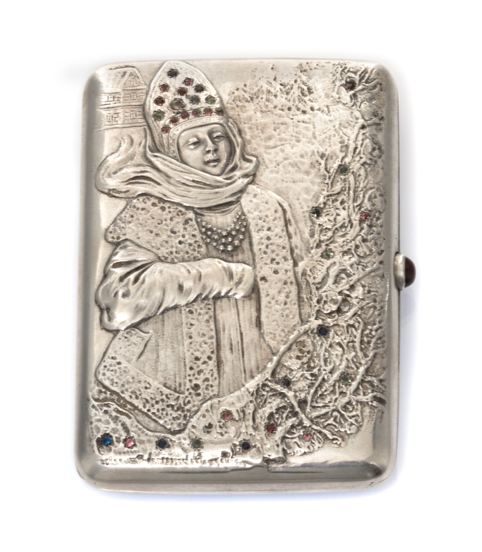 the lid worked to show a figure in traditional attire with a jeweled hat in a winter landscape.