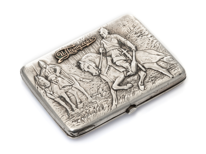 the lid worked to show two warriors on horseback with an applied Cyrillic name plate.
