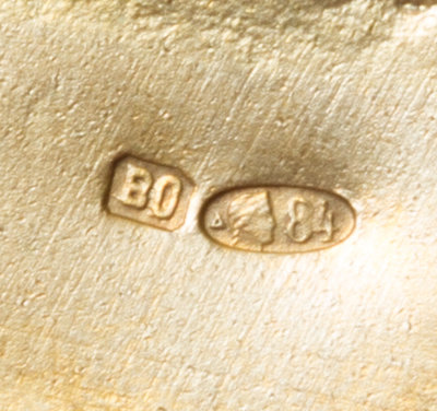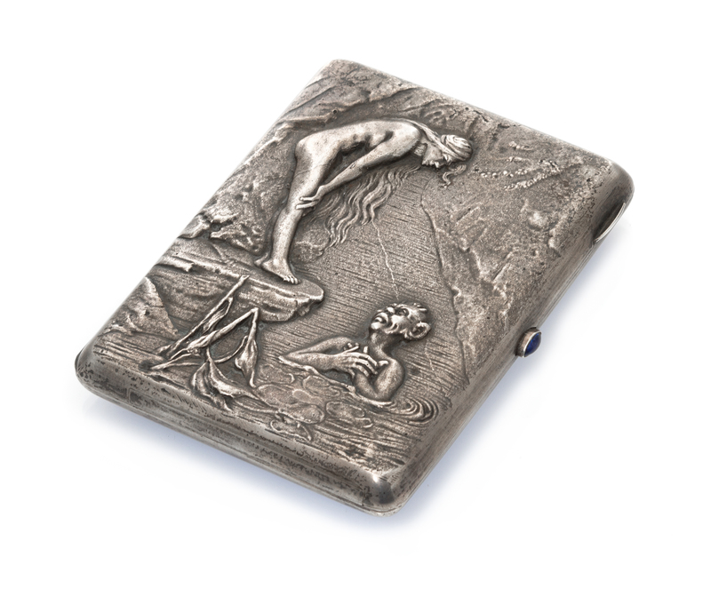 the case worked to show a vodyanoy courting a nude woman, having a blue-colored cabochon clasp.