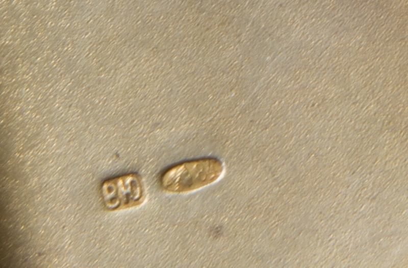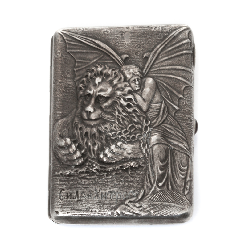the lid worked to show a woman clinging to the back of a winged lion, the underside having an applied Cyrillic monogram, with a red cabochon clasp.