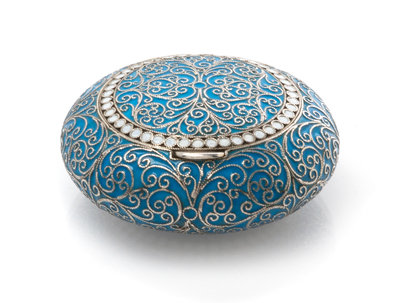 of circular form, having a light blue enameled ground and filigree scrolls throughout.