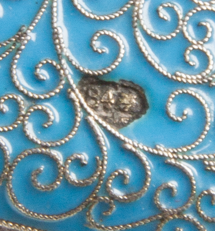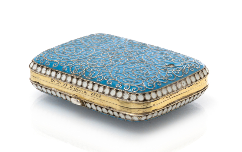 the case with a light blue enameled ground and filigree scrolls throughout.