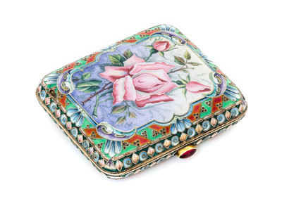 one side decorated with a plaque painted with roses, the reverse with polychrome floral and foliate enameling and having a red cabochon clasp, the case opening to a fabric lined interior.