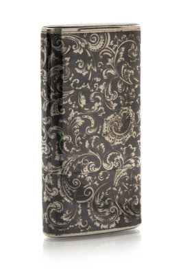 having a lift-off lid opening to a vacant interior, the case decorated with foliate scrolls throughout and having a hinged compartment with a match strike strip.