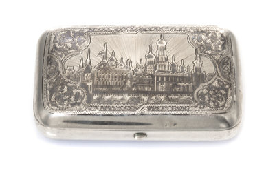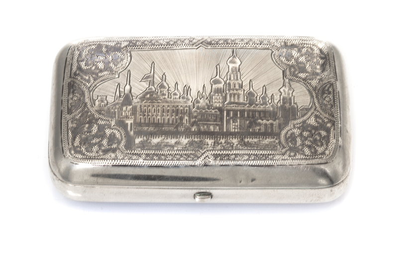 the lid decorated with an image of the Moscow Kremlin, the underside with a vacant cartouche surrounded by foliate scrolls.