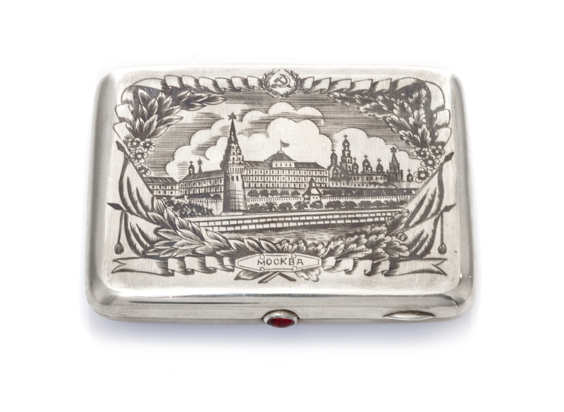 the lid with an image of the Moscow Kremlin surrounded by a floral and foliate border beneath the hammer and sickle, with a red cabochon clasp.