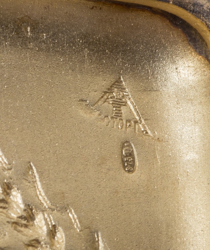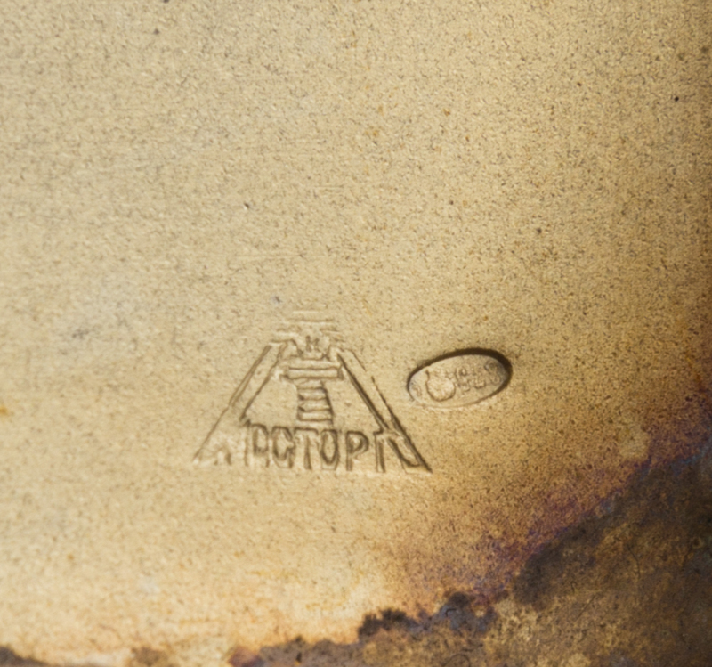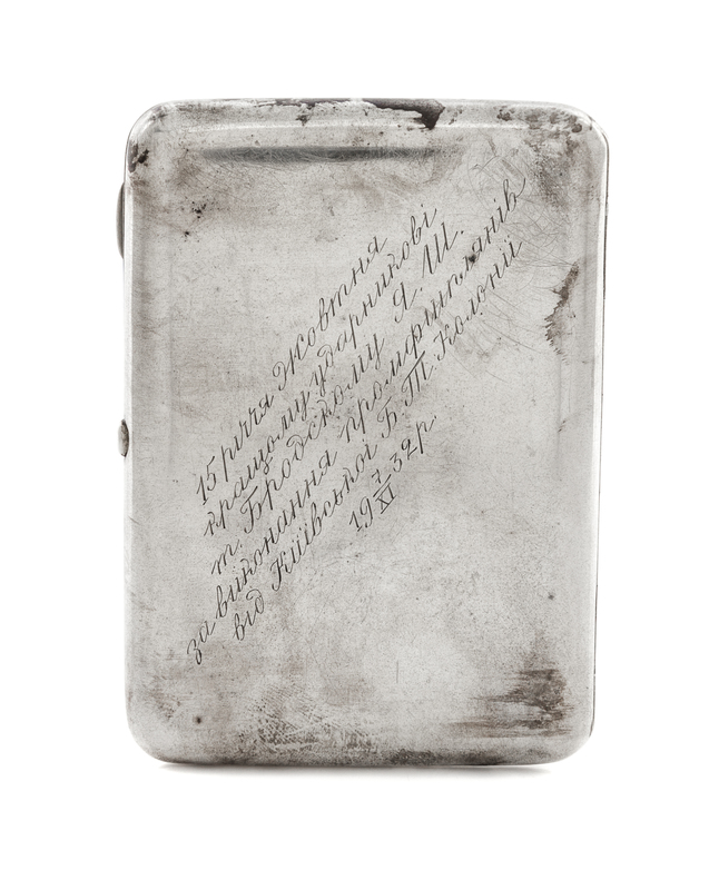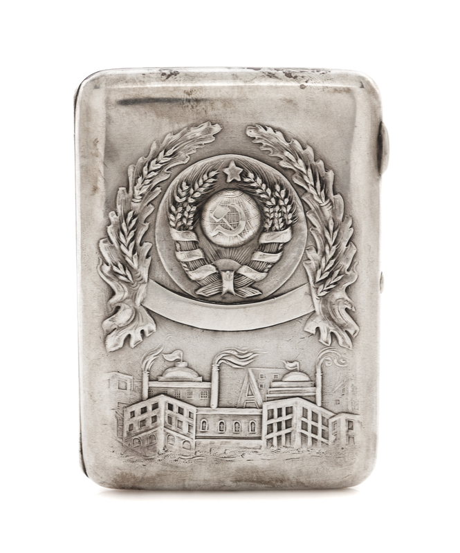 the lid worked with the seal of the Soviet Union above an industrialized city, the underside with an engraved Cyrillic inscription.